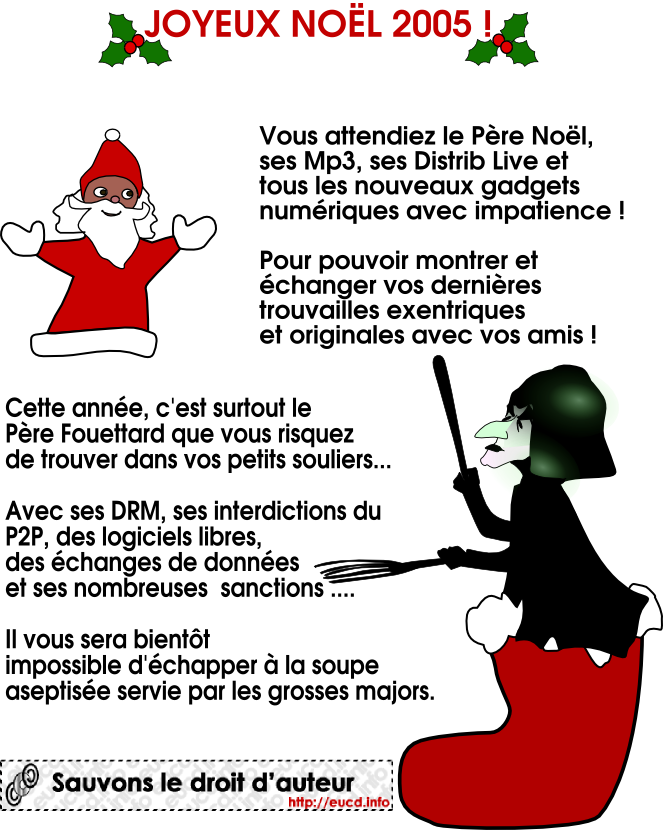 Les nuits des 22 et 23 décembre 2005 (admirez le choix des dates! hémicycle vide à 90%…), sera débattu le projet de loi DADVSI (Droit de l’Auteur et Droits Voisins dans la Société de l’Information), dont l’urgence(?) a été décrétée par le gouvernement.